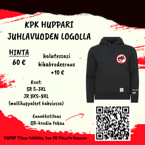 Musta huppari juhlavuoden logolla (Warrior sports hoodie). Hinta 60 € ja halutessasi nimi ja/tai pelinumero brodeerattuna hihaan, hinta 70 €. Sovituskappaleita jäähallin kahviossa.